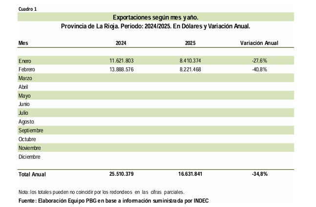 La Rioja cerró el primer bimestre de 2025 con un intercambio comercial de 27.873.970 dólares, lo que representa una caída del 27,7% en comparación con el mismo período del año anterior. Las exportaciones provinciales sumaron 16.631.841 dólares, un 34,8% menos que en 2024, mientras que las importaciones alcanzaron los 11.242.128 dólares, con una disminución del 13,8%.