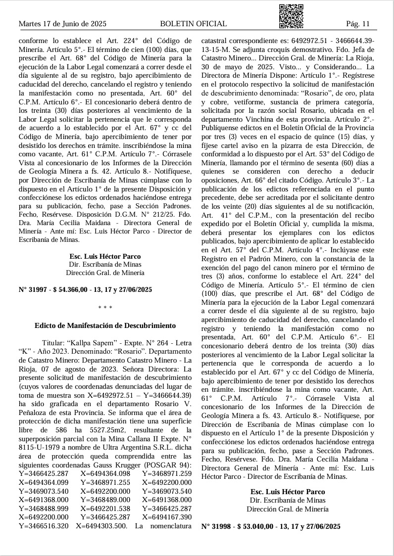 La actividad minera en la provincia de La Rioja muestra nuevos movimientos. La Dirección General de Minería, a través de edictos recientes, oficializó la manifestación de descubrimiento de dos nuevos prospectos de oro, plata y cobre a nombre de la empresa Kallpa SAPEM. Se trata de los proyectos denominados “Carolina” y “Rosario”, que inician su proceso exploratorio formal.
