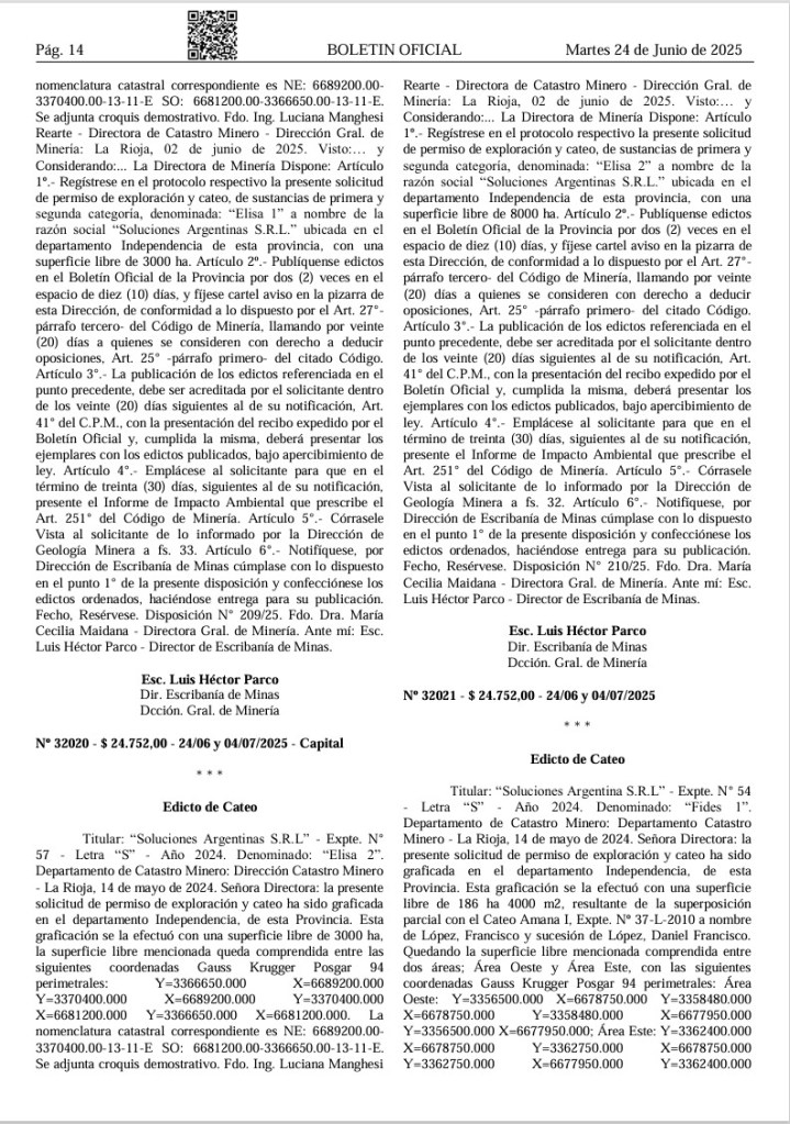 El mapa minero de La Rioja continúa expandiéndose con nuevas solicitudes de exploración. La Dirección General de Minería de la provincia dio luz verde a la empresa Soluciones Argentinas S.R.L. para iniciar el cateo en tres proyectos denominados “Elisa 1”, “Elisa 2” y “Fides 1” y “Fides 2”, que abarcan un total de 11.186 hectáreas en el departamento Independencia.