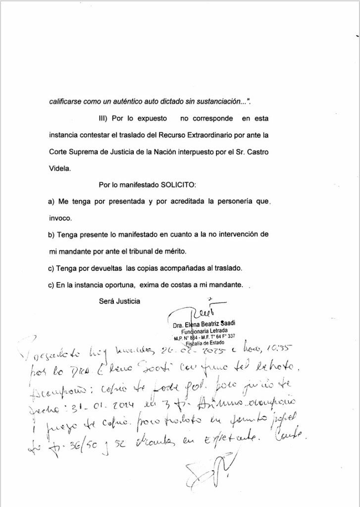 En su escrito ante la Corte Suprema, la Fiscalía de Estado se limitó a solicitar que se tenga por acreditada su personería, se tome nota de la no intervención de su mandante ante el tribunal de mérito, se den por devueltas las copias del recurso y se les exima de costas.