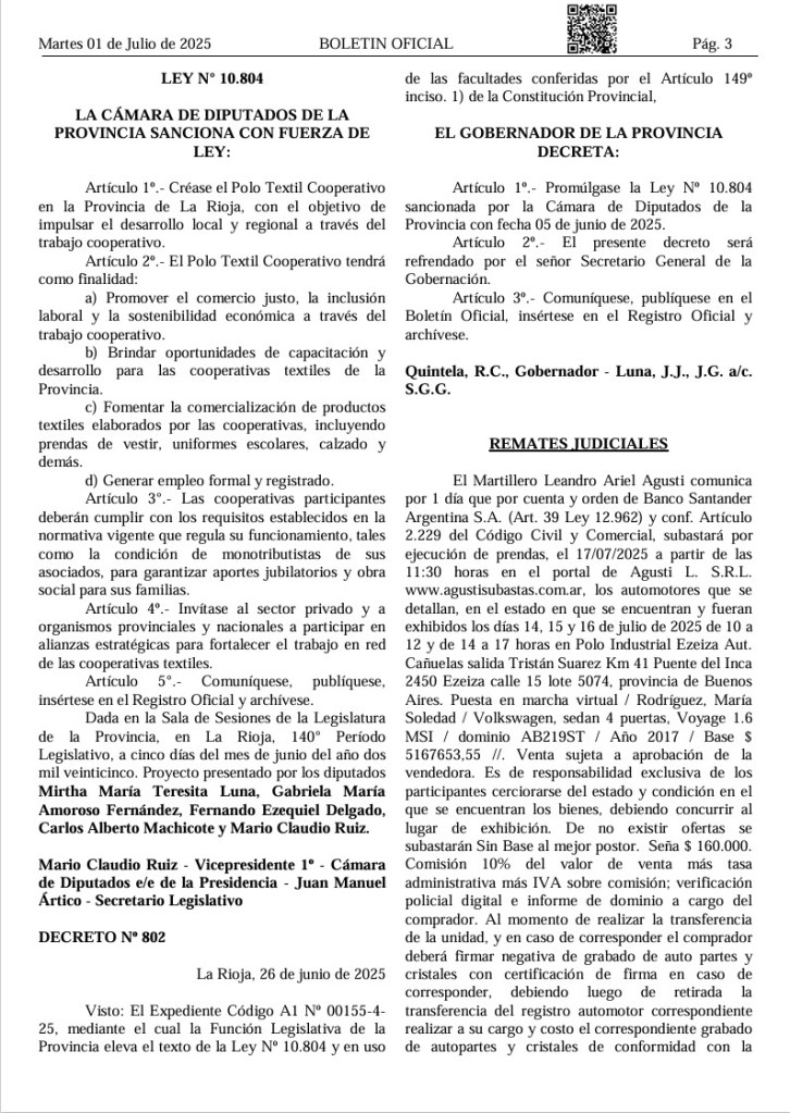 La Ley N° 10.804 fue sancionada por la Cámara de Diputados de La Rioja el pasado 5 de junio y, apenas 21 días después, el 26 de junio, el gobernador Quintela la promulgó mediante el Decreto N° 802, reafirmando el compromiso del gobierno provincial con el desarrollo productivo y el cooperativismo local.