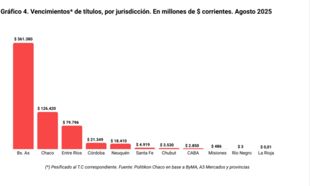 A nivel nacional, los vencimientos de títulos públicos provinciales alcanzaron un total de $619.144 millones en agosto de 2025. La provincia de Buenos Aires concentró el 58,4% del total, seguida por Chaco (20,4%) y Entre Ríos (12,9%).
