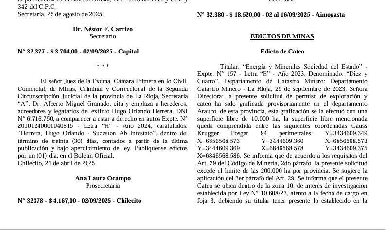 Las disposiciones de la directora general de Minería, María Cecilia Maidana, establecen la publicación de edictos en el Boletín Oficial de la provincia, llamando a quienes se consideren con derecho a «deducir oposiciones» en un plazo de 20 días.