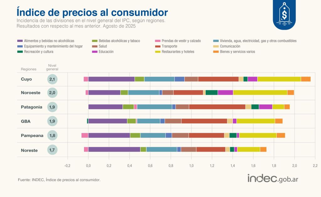 El análisis regional muestra que la inflación no se comportó de la misma manera en todo el país. La región de Cuyo fue la que tuvo la mayor suba mensual, con un 2,1%, seguida de cerca por el Noroeste, con un 2%.