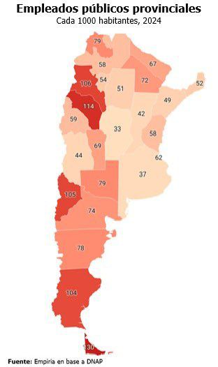 El mapa también muestra una tendencia general en la distribución del empleo público. Las provincias con mayores ratios se concentran principalmente en el norte y en el sur de Argentina. Además de La Rioja y Catamarca, otras jurisdicciones con un alto número de empleados públicos por habitante son Salta (106), Jujuy (114) y Tierra del Fuego (130).