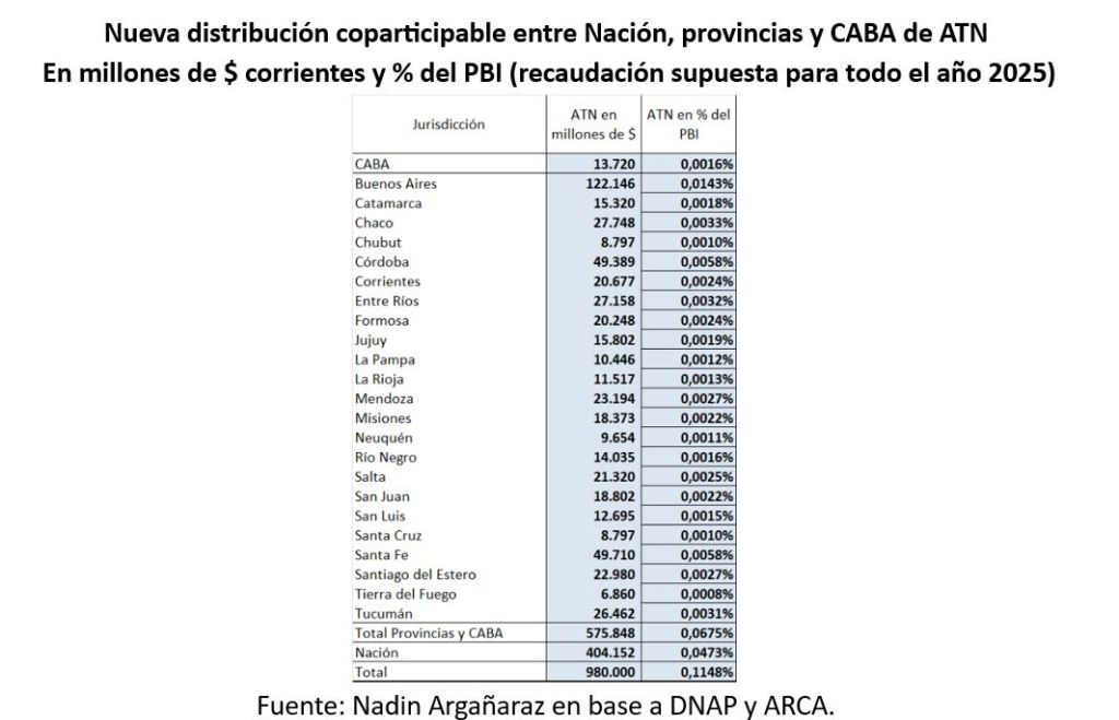 El economista Nadín Argañaraz elaboró un informe que analiza el impacto fiscal de la nueva ley que cambia la distribución de los Aportes del Tesoro Nacional (ATN), convirtiéndola en un reparto automático entre la Nación, las provincias y la Ciudad Autónoma de Buenos Aires (CABA). Los fondos anuales en cuestión ascienden a $980.000 millones, lo que representa el 0,11% del Producto Bruto Interno (PBI).