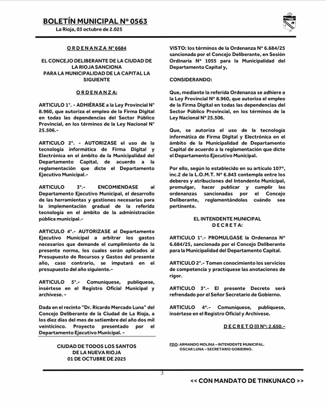 Con el objetivo de modernizar y eficientizar la gestión pública, el Concejo Deliberante de la Capital riojana sancionó la Ordenanza N° 6684, que autoriza el uso de la firma digital en el ámbito del municipio. La medida, que fue promulgada por el intendente Armando Molina mediante el Decreto N° 2650, busca agilizar los trámites y reducir la burocracia, adhiriendo a la Ley Provincial N° 8.960 y la Ley Nacional N° 25.506.