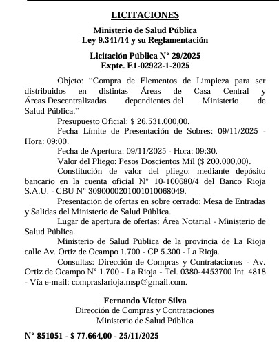 La Licitación Pública N° 29/2025 estableció condiciones estrictas para los proveedores interesados en adjudicarse el contrato. El cronograma marcó como fecha clave el pasado 9 de noviembre, momento en que se realizó la recepción y apertura de las propuestas en el «Área Notarial – Ministerio de Salud Pública», ubicada en la Avenida Ortiz de Ocampo 1.700 de la capital riojana.