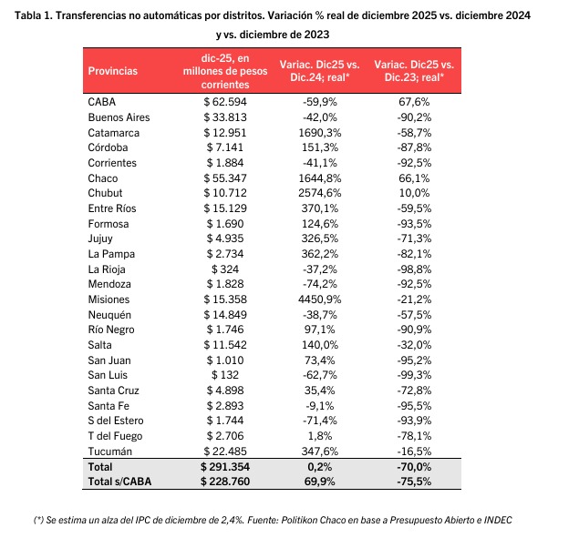 El informe de Politikon destaca que, a nivel nacional, los envíos de diciembre mostraron una leve variación positiva del 0,2% interanual, pero esto no se tradujo en un alivio homogéneo. La Ciudad de Buenos Aires (CABA) lideró la captación de fondos con el 21,5% del total, impulsada por el cumplimiento de la medida cautelar de la Corte Suprema.