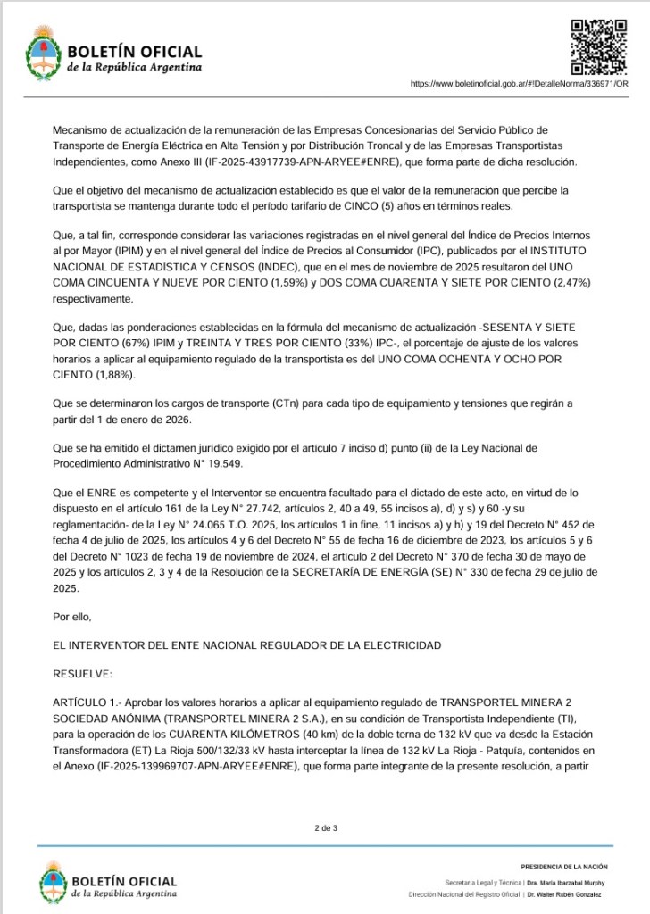 A través de la Resolución 833/2025, el organismo interventor dispuso la actualización de los valores horarios para la empresa Transportel Minera 2 Sociedad Anónima, encargada de un tramo clave del sistema de alta tensión en la provincia. La normativa, que lleva la firma del Interventor del ENRE, entró en vigencia el 1° de enero y confirma la vigencia de la emergencia energética prorrogada hasta mediados de este año.