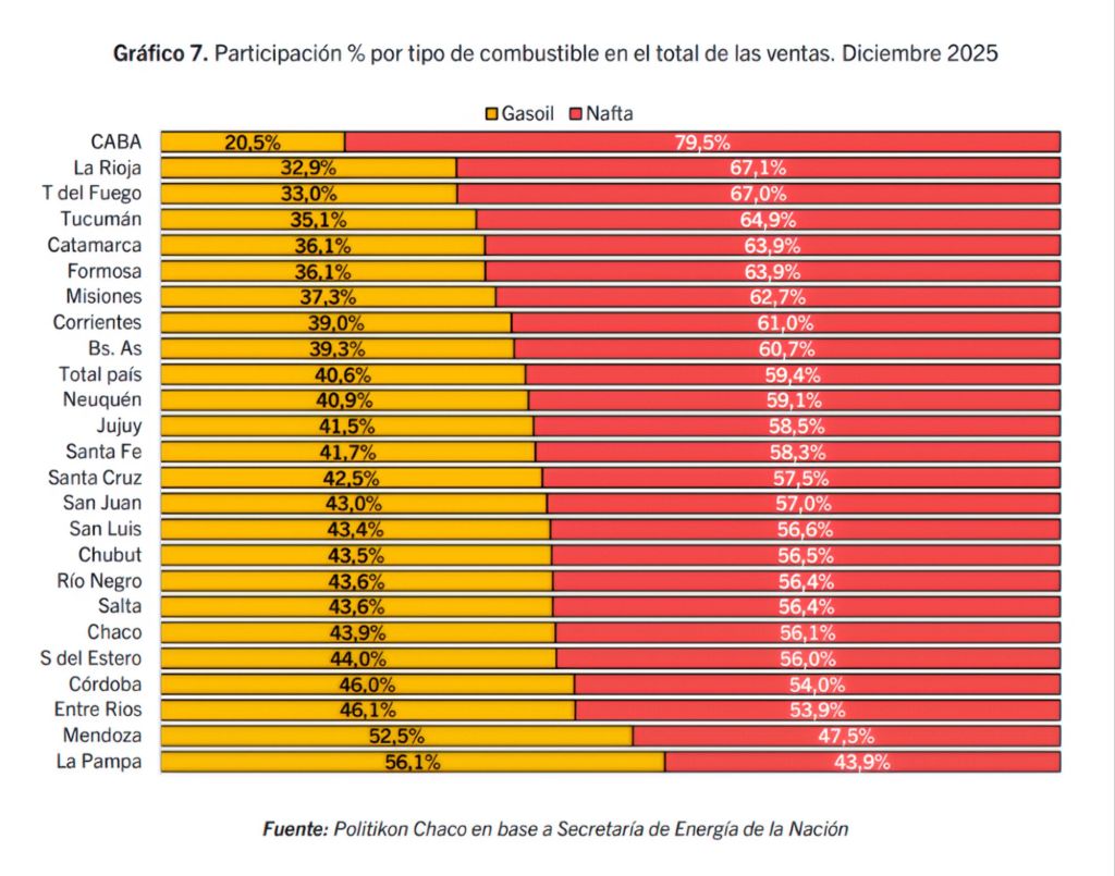 La matriz de consumo en la provincia muestra una clara preferencia por las naftas, que explicaron el 67,1% de las ventas en diciembre, dejando al gasoil con una participación del 32,9%.