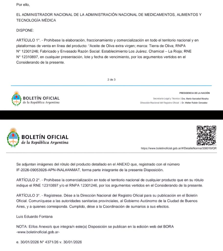 La clave para determinar la ilegalidad del aceite surgió del cruce de datos con las autoridades locales. Según detalla el texto oficial, la Dirección General de Control de la Industria Alimenticia de Córdoba realizó las consultas pertinentes a la Dirección de Seguridad Alimentaria de la provincia de La Rioja.