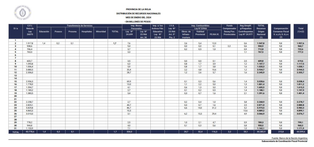 La dinámica actual contrasta con lo ocurrido en el período anterior. En enero de 2024, en pleno ajuste inicial de la gestión nacional, La Rioja había percibido $44.599,6 millones.
