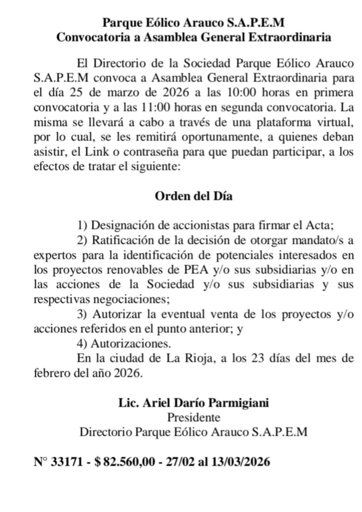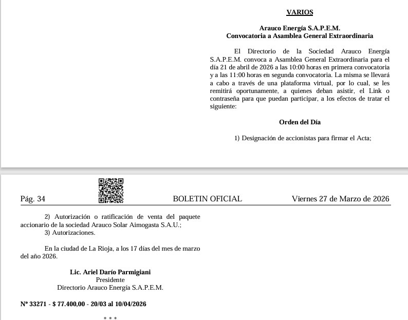 En paralelo, Arauco Energía S.A.P.E.M. convocó a una asamblea extraordinaria con un punto central: la autorización o ratificación de la venta del paquete accionario de Arauco Solar Aimogasta S.A.U.