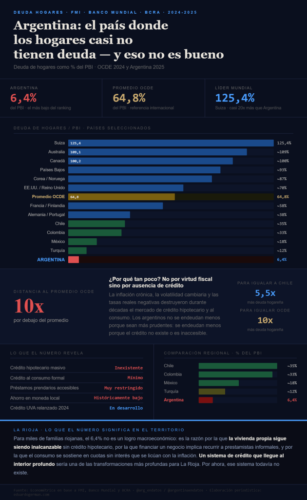 El 6,4% que Argentina marca en el ranking de la OCDE es, en ese sentido, una medida del tamaño de la oportunidad perdida. Un sistema financiero que funcione y llegue a los hogares del interior profundo —con crédito genuino, tasas reales y plazos razonables— sería una de las transformaciones más profundas que podría experimentar una provincia como La Rioja. Por ahora, ese sistema no existe. Y el gráfico lo confirma.