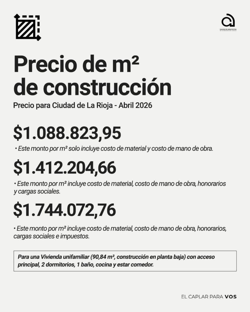 El Colegio de Arquitectos de La Rioja publicó el precio oficial del metro cuadrado de construcción para abril de 2026: $1.088.823,95 solo en materiales y mano de obra, pero el costo real con honorarios, cargas sociales e impuestos trepa hasta $1.744.072,76. El informe, que a partir de este año se difundirá mensualmente, toma como referencia una vivienda unifamiliar de 90,84 m² en planta baja.