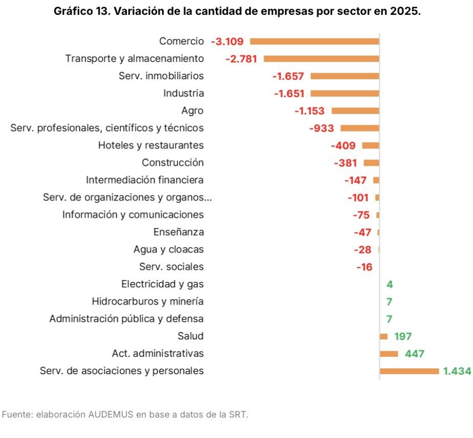 El ajuste macroeconómico que el gobierno nacional exhibe como su principal logro tiene una contracara que los datos sectoriales exponen con precisión: en 2025 el tejido empresarial argentino se contrajo de manera sostenida, con 10.392 firmas menos al final del año respecto del inicio. El dato surge de un relevamiento elaborado por AUDEMUS Consultora en base a información de la Superintendencia de Riesgos del Trabajo (SRT).