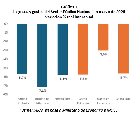El Instituto Argentino de Análisis Fiscal (IARAF) difundió este miércoles su informe de ejecución presupuestaria nacional correspondiente a marzo de 2026, que confirma que el equilibrio de las cuentas públicas defendido como bandera por el presidente Javier Milei atraviesa su fase más frágil desde el inicio del programa económico. En el tercer mes del año, los ingresos totales del Sector Público Nacional no Financiero cayeron 5,8% real interanual y el gasto primario retrocedió en la misma proporción, configurando un esquema de ajuste simétrico que profundiza la recesión del gasto público.