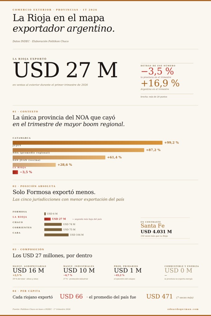 El informe trimestral de Politikon Chaco sobre el origen provincial de las exportaciones argentinas muestra a La Rioja entre las seis jurisdicciones que retrocedieron en el primer trimestre de 2026, en un país cuyas ventas externas crecieron 16,9 % y cuya propia región —el NOA— avanzó 61,4 %, traccionada por los saltos de Catamarca, Jujuy y Salta. En términos absolutos, la provincia facturó USD 27 millones al exterior, el segundo monto más bajo del país después de Formosa. El colapso se concentró en productos primarios, que cayeron 45,2 % interanual. La matriz exportadora riojana, que ya era pequeña, se achicó.