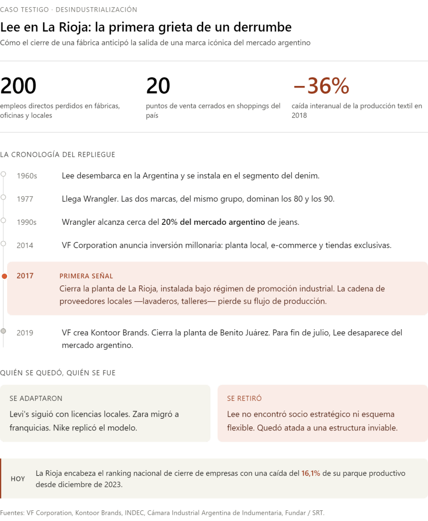 La salida definitiva de la marca Lee del mercado argentino, concretada en 2019, no fue un episodio repentino. La primera campanada se había producido dos años antes en La Rioja, donde la firma operaba una de sus plantas industriales bajo el paraguas del régimen de promoción industrial provincial. El cierre de esa fábrica en 2017 funcionó como aviso temprano de un proceso de retracción que terminaría arrastrando a toda la operación nacional de la compañía.