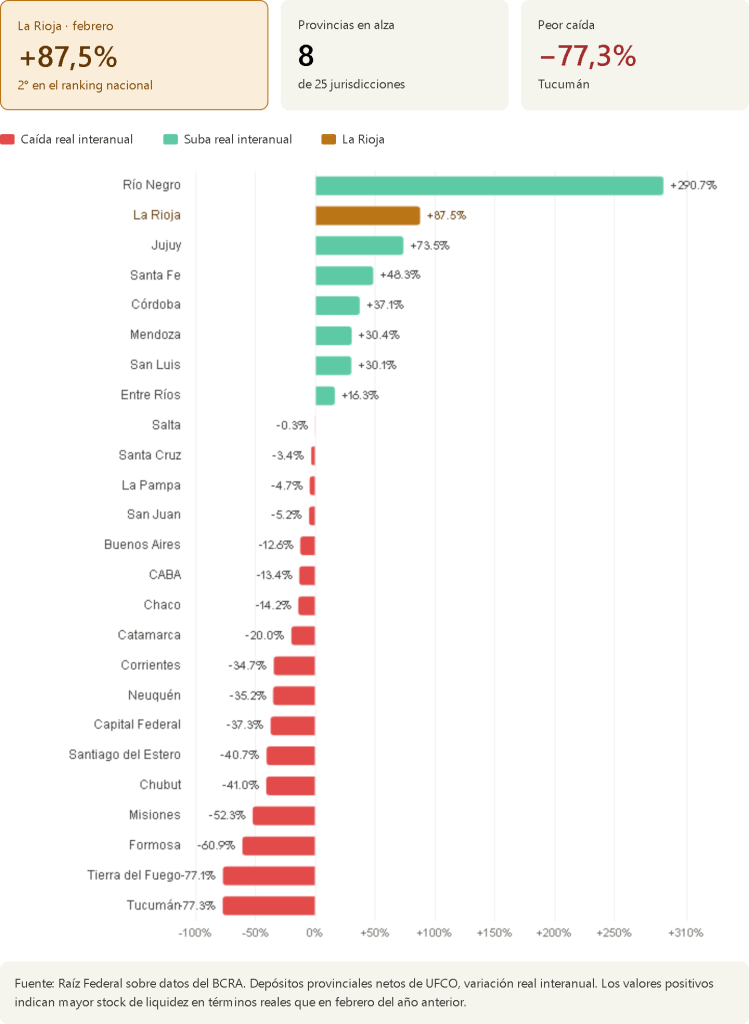 La Rioja se ubicó como la segunda provincia argentina con mayor crecimiento real interanual de sus depósitos bancarios netos de UFCO durante el mes de febrero, con una expansión del 87,5%, según un relevamiento del observatorio Raíz Federal sobre datos del Banco Central de la República Argentina. La performance coloca a la provincia gobernada por Ricardo Quintela en el podio nacional, detrás solo de Río Negro (+290,7%) y por delante de Jujuy (+73,5%).