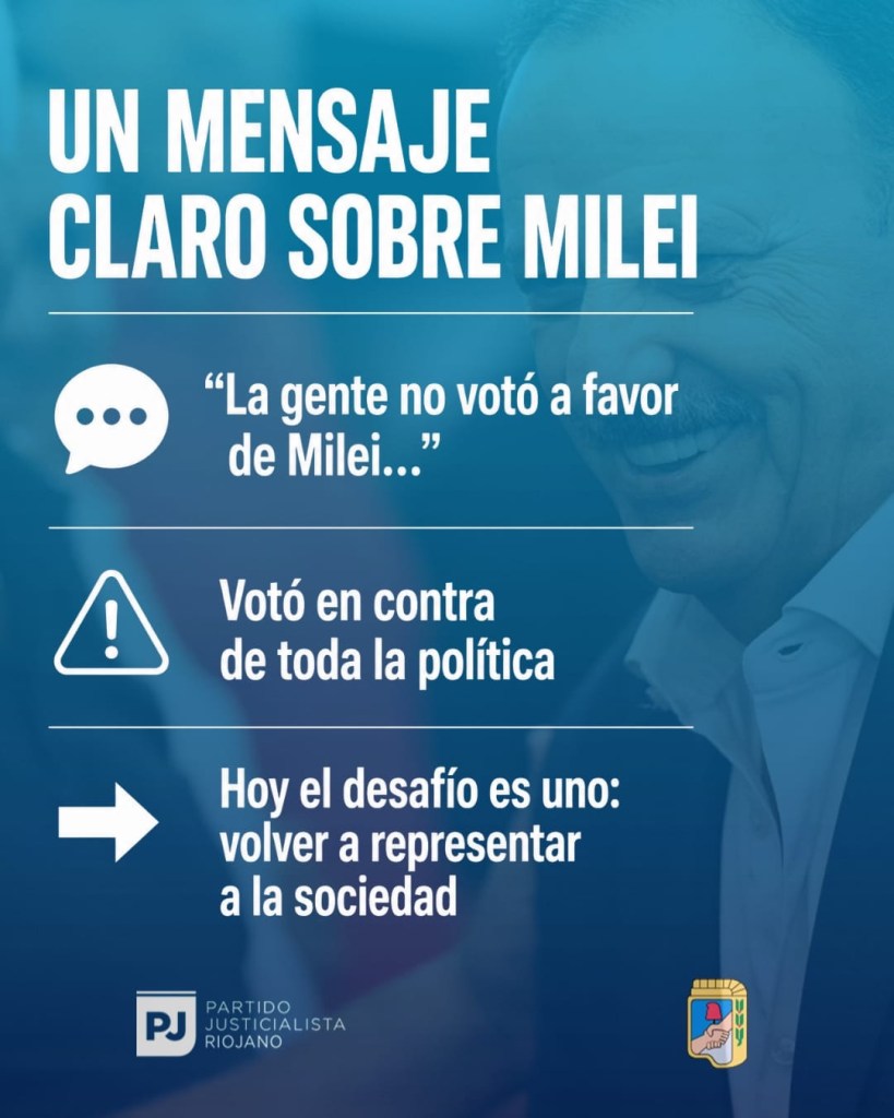 Otra placa exhibe «Un mensaje claro sobre Milei» con tres bloques específicos: «La gente no votó a favor de Milei», «Votó en contra de toda la política» y «Hoy el desafío es uno: volver a representar a la sociedad». La definición opera como cuadro interpretativo del propio voto del 2023, en línea con el diagnóstico que el gobernador formuló públicamente cuando sostuvo que la victoria libertaria fue «un repudio a toda la clase política» más que un respaldo programático al modelo macroeconómico.