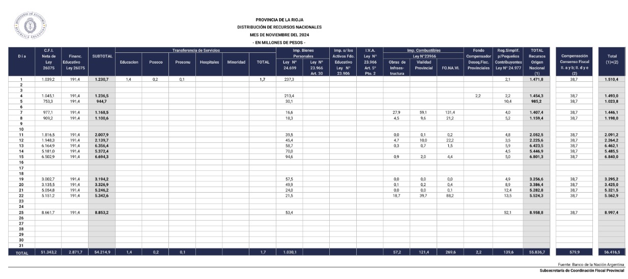 La provincia de La Rioja ha recibido más de $56.416 millones en concepto de recursos coparticipables nacionales durante noviembre. El…