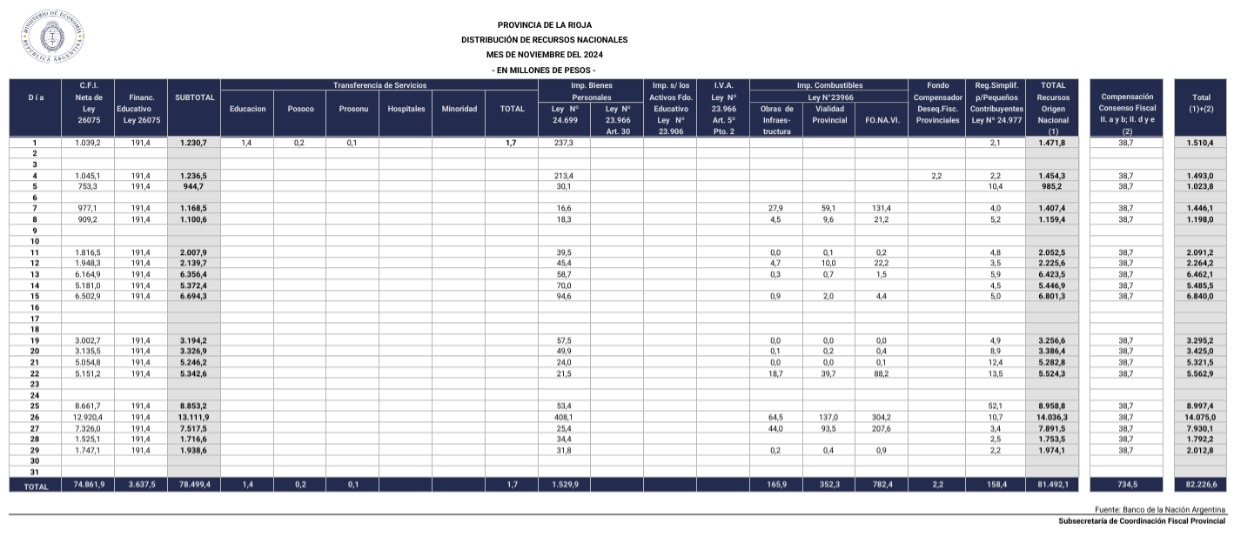 La distribución de recursos nacionales para la provincia de La Rioja en noviembre alcanzó un total de $82.226 millones, incluyendo…