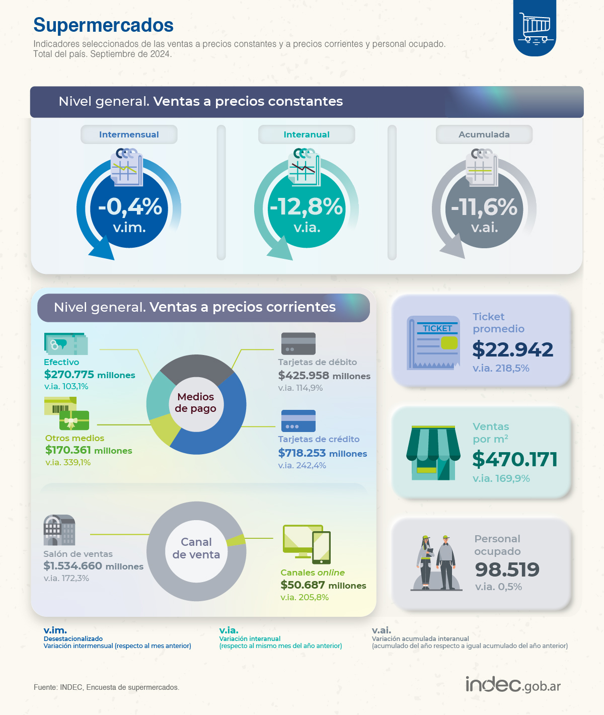 En septiembre de 2024, las ventas en supermercados cayeron un 12,8% en términos reales interanuales, según el INDEC. En precios…