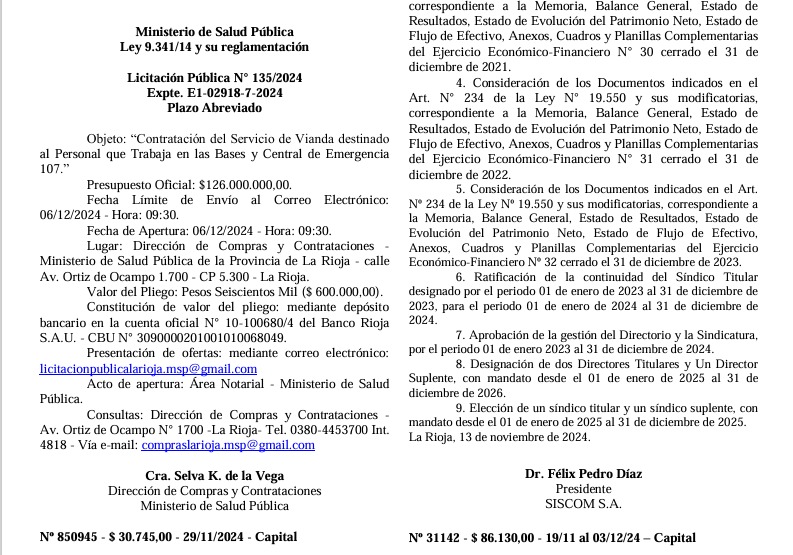 Con un presupuesto de $126 millones, el Ministerio de Salud Pública de La Rioja abrió la Licitación Pública N° 135/2024…