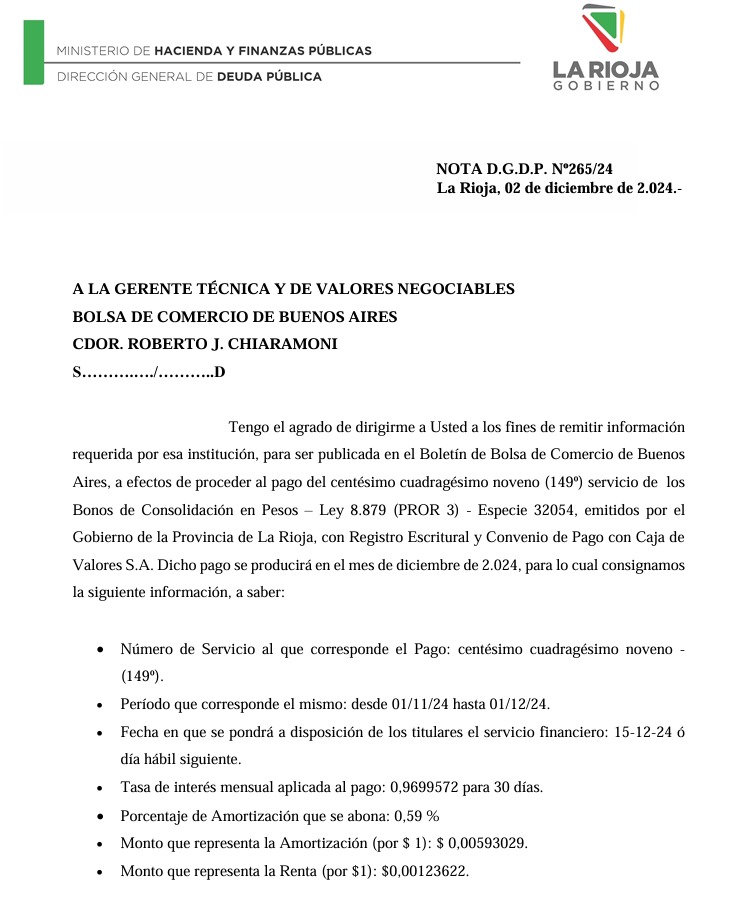 El Gobierno de La Rioja informó que procederá al pago del servicio número 149 de los Bonos de Consolidación en…
