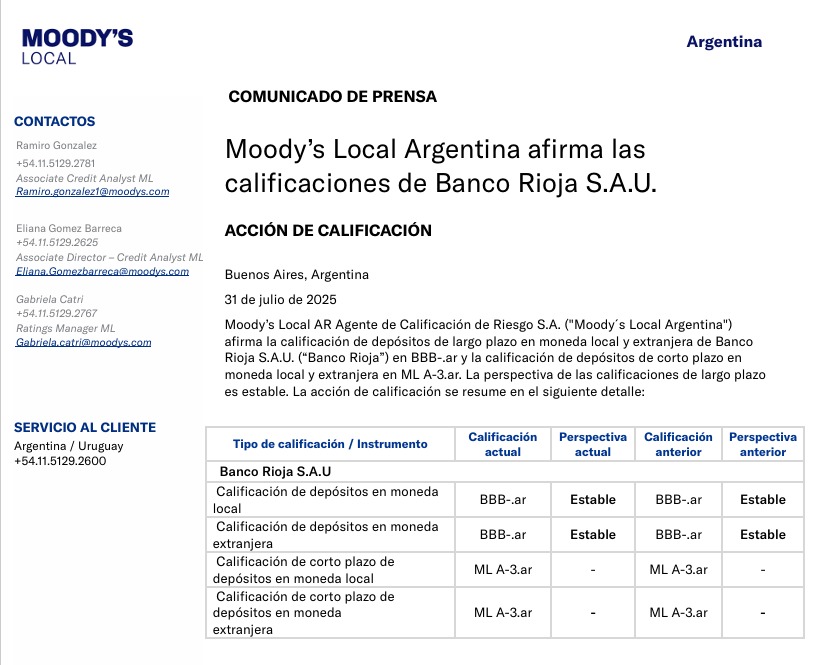 Moody’s Local AR Agente de Calificación de Riesgo S.A. (Moody’s Local Argentina) afirmó la calificación de depósitos de largo plazo…