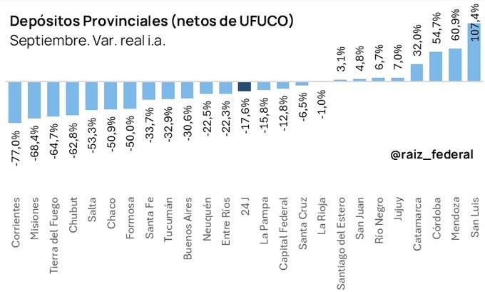 El informe de Raíz Federal (@raiz_federal) sobre la variación real interanual de los depósitos provinciales en septiembre (netos de UFUCO)…
