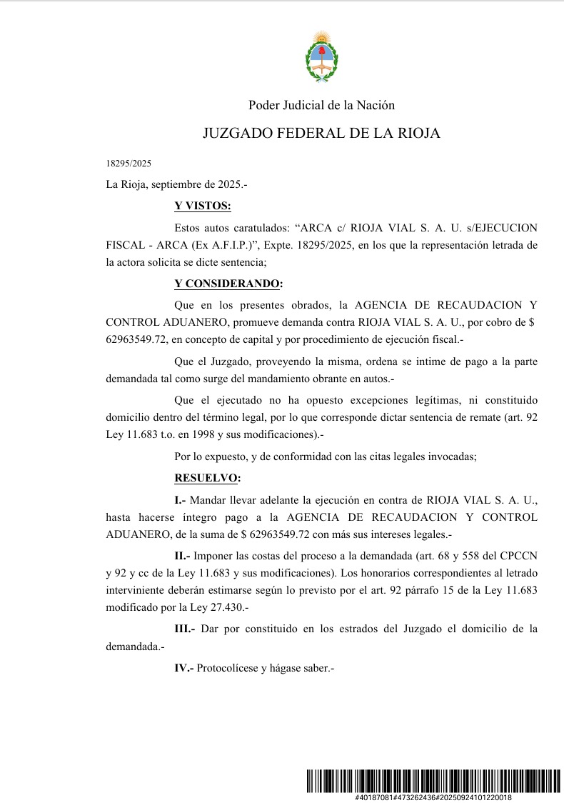 La sentencia, dictada por el Juez Federal de La Rioja, ordena la ejecución contra la empresa por una deuda de…